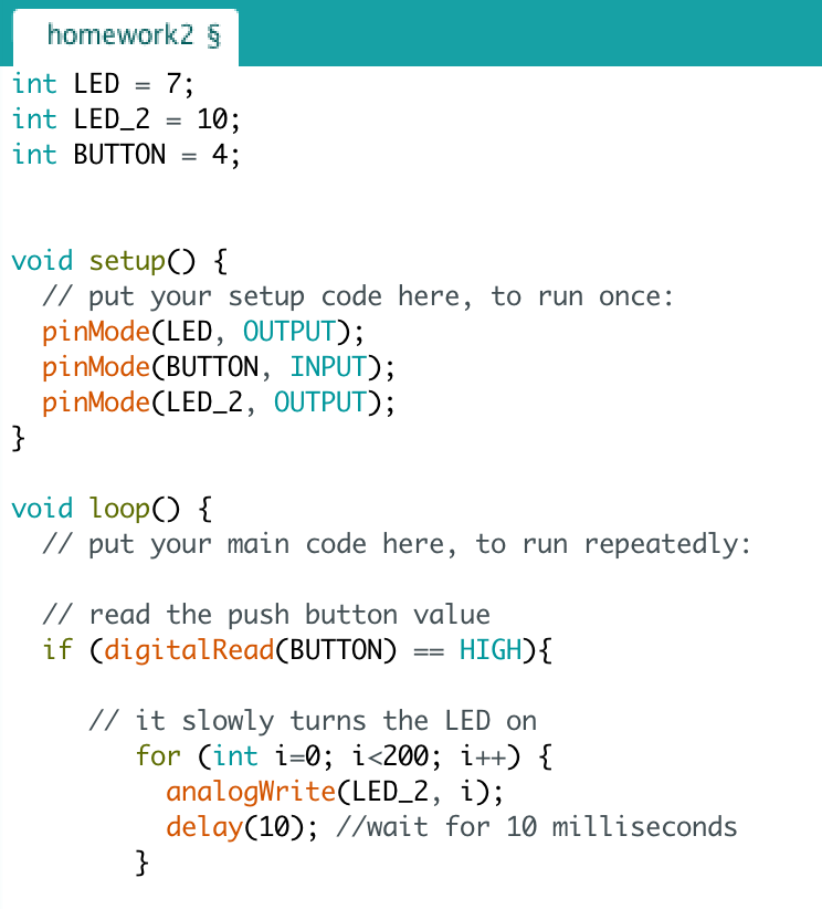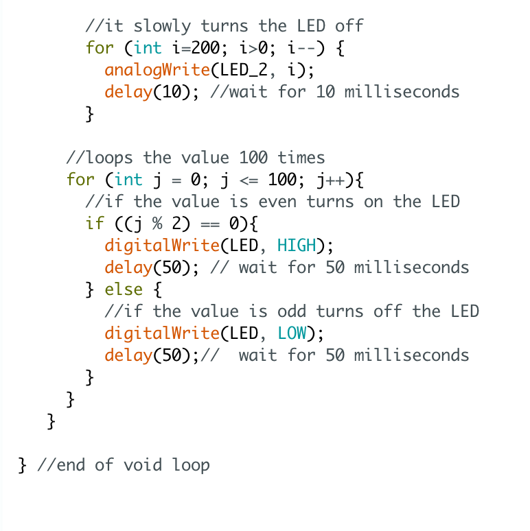 it triggers the action for the code. The blue LED starts to fade in and waits for 10 milliseconds and to fade out for 10 milliseconds.