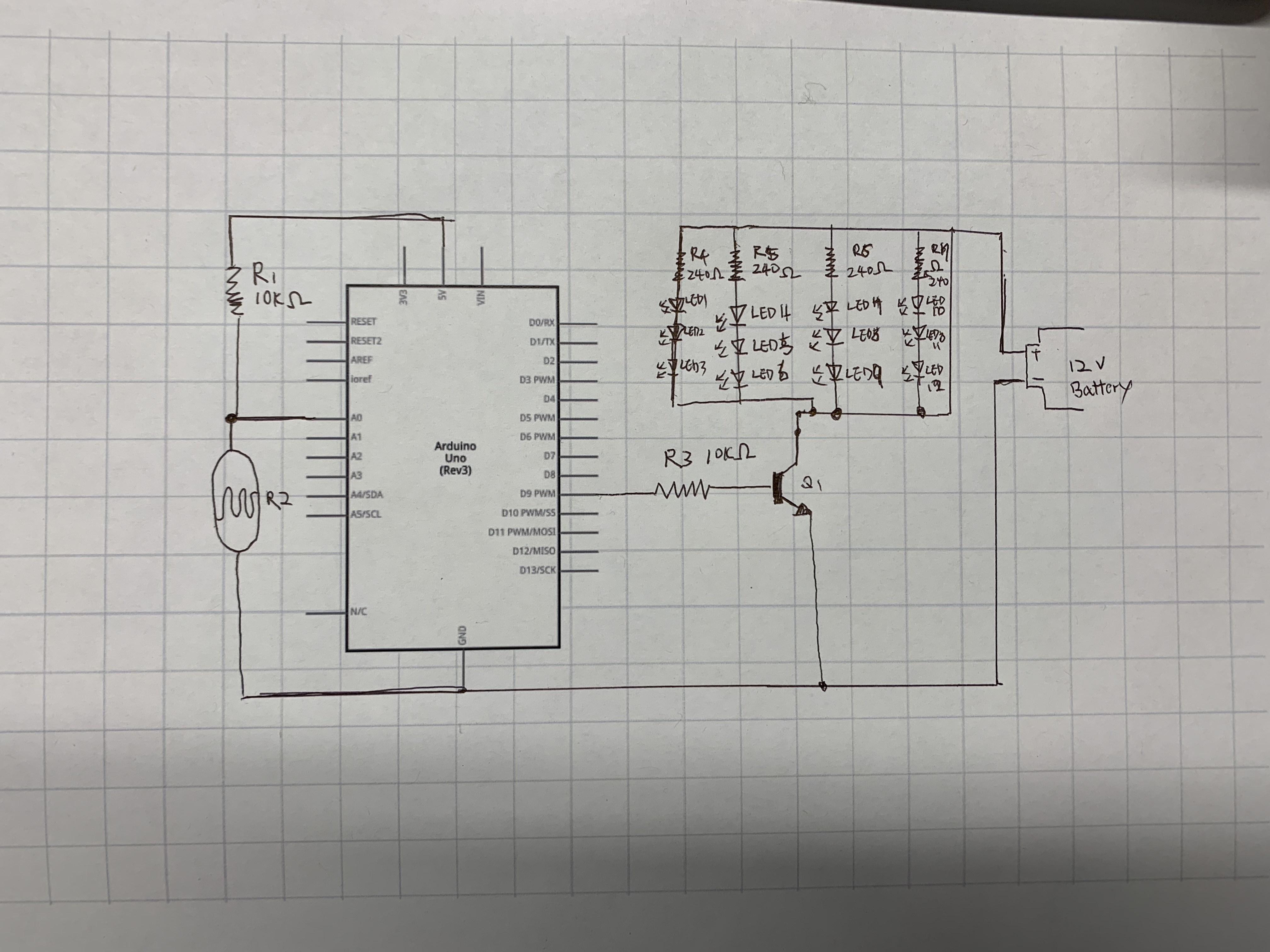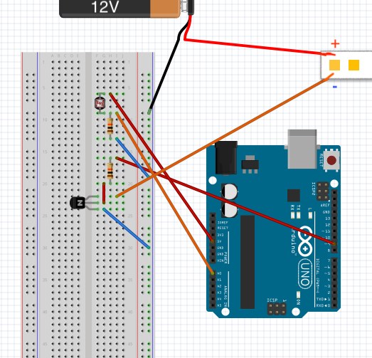 There is one output from the Arduino board pin modes (#9) and one input for the photoresistor (A0).
