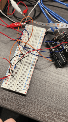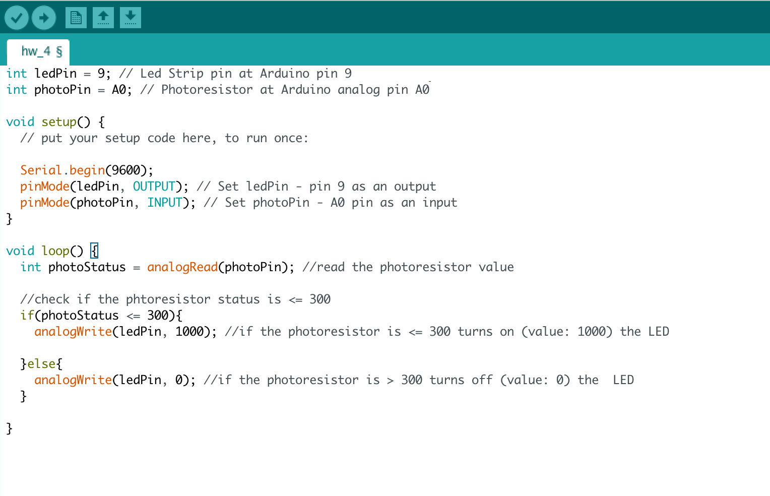 When the photoresistor value is equal or below 300 (dark) then it turns the LED strip.