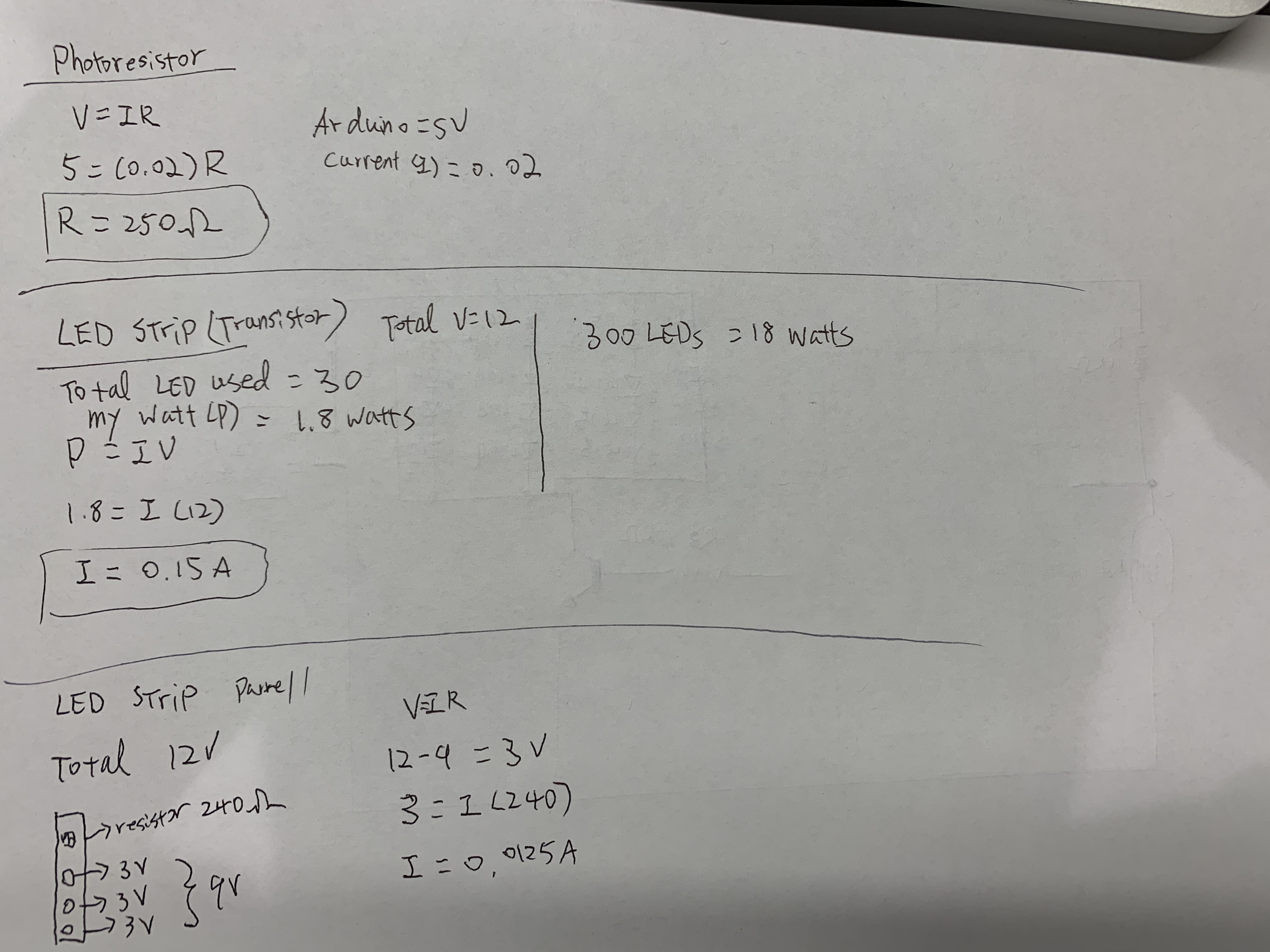For the resistor for base (connected to pin 9), I chose 10k ohms, because even without considering the voltage drop from the LED strip; R = P (12v)/I(o.o2A) which is 600 ohms. To secure my Arduino I chose 10k ohms for the resistor. I also calculated the current flow for each LED strip.