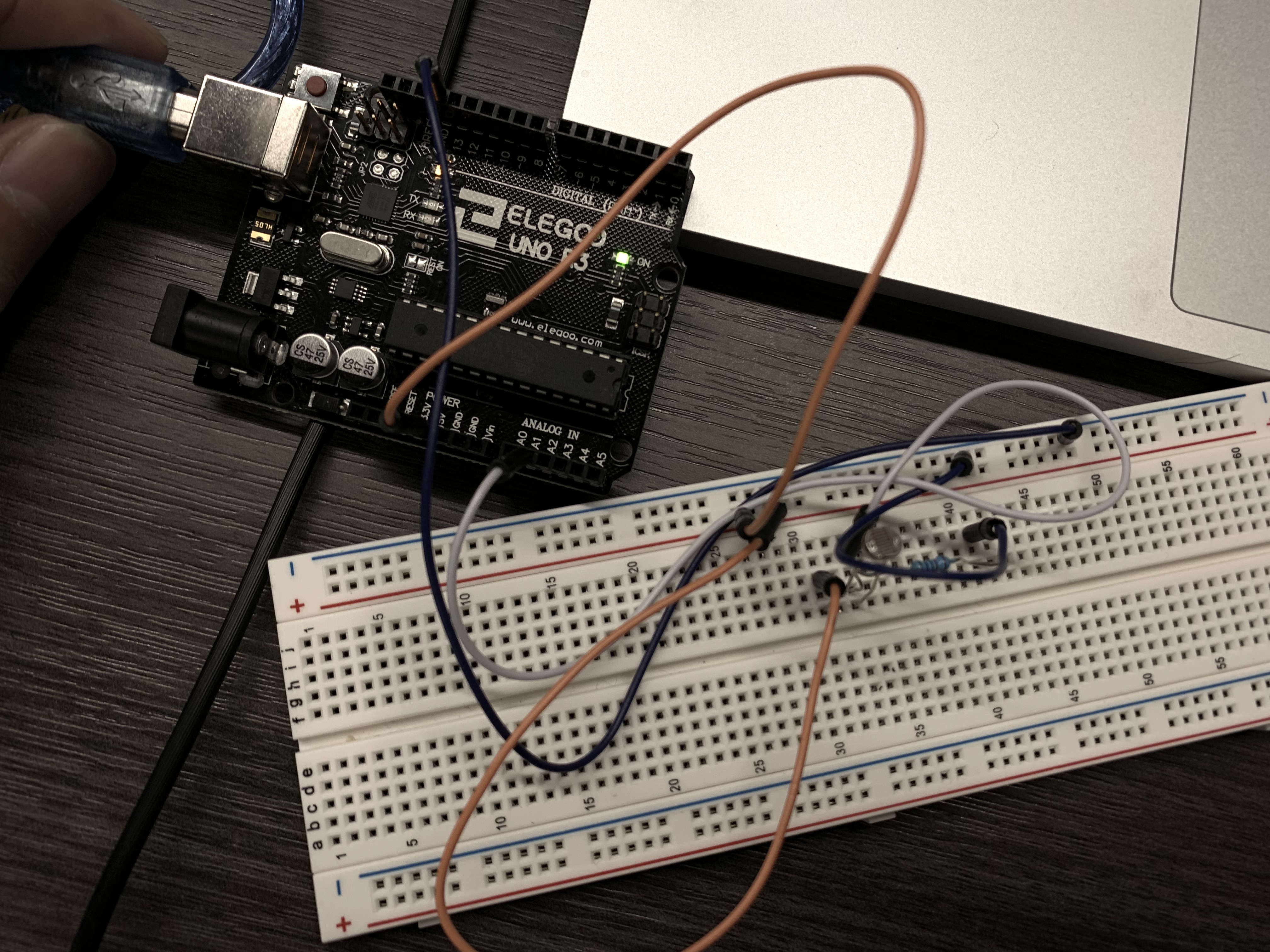 The photoresistor is connected to the 5V power pin and the ground pin. Also, I chose A1 for the input pin to get the data from AnalogRead().