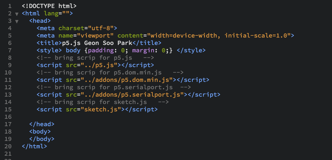 This code is a html code for the interactive webpage. In the index.html, it reads four scripts: p5.js, p5.dom.min.js, p5.serialport.js, and sketch.js.