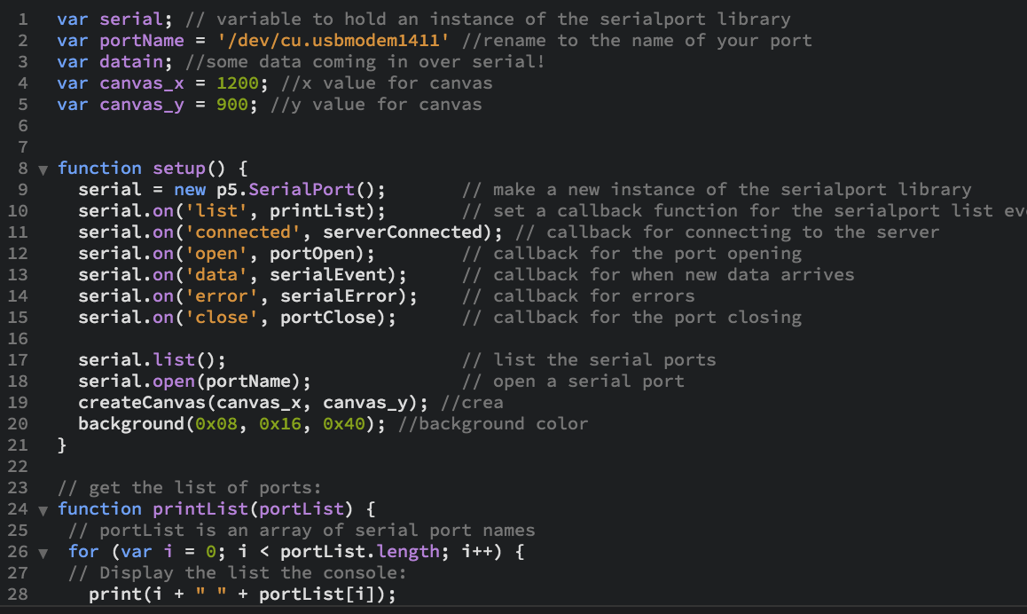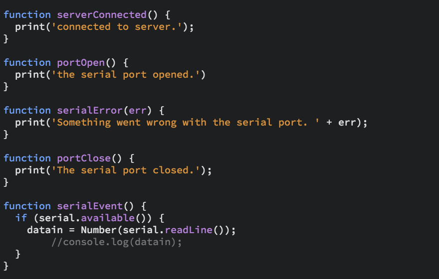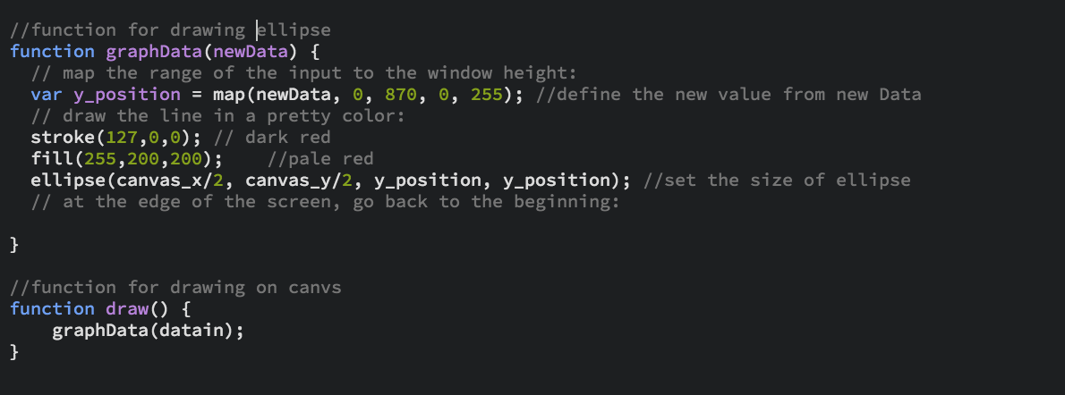 This is a sketch.js that gets the data from the serialport library and use that data to draw ellipse. I set the value for the x and y values for canvs size. In the graphData function, I used the map function to set the min and max (from 0 ~ 870) value for the graph. Then, I chose the stroke color to be dark red and ellipse color to be pale red. Lastly, in the ellipse function, the x and y size should be depend on the data value and the position should be located in the center of the canvs. The draw function draws ellipse. This is a sketch.js that gets the data from the serialport library and use that data to draw ellipse. I set the value for the x and y values for canvs size. In the graphData function, I used the map function to set the min and max value for the graph. Then, I chose the stroke color to be dark red and ellipse color to be pale red. Lastly, in the ellipse function, the x and y size should be depend on the data value and the position should be located in the center of the canvs. The draw function draws ellipse.
