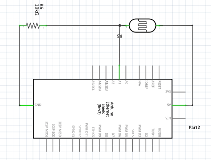 For the photoresistor, I used 10k resistor. The maximum current allowed to go into the ground pin is 200mA and I chose 5V for the power. R = V/I = 5v/0.02A = 250a. We need a resistor bigger than 250a. Furthermore, we need to use a resistor divider to allow the high impedence Anlog input to measure the voltage. We need to use the formula: Vout=Vin*(R2/(R1+R2)) to find the value for Vout. Vin is the 5V, R6 is 10k ohm, and R5 is the photoresistor(10k ohm).